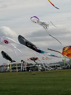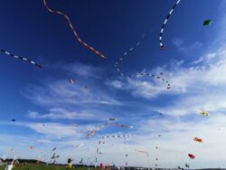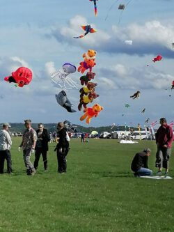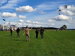 Am Sonntag schenkte uns der Wettergott noch ein paar Windstärken mehr, so dass das Fliegen mit Lenkdrachen teilweise nur noch mit “Vented”-Drachen Spaß machte. Die Menschenmassen, die an diesem letzten Tag auf das Fest strömten, steigerten sich nochmal und da sich die Besucher mit ihren eigenen Drachen nun überall verteilten, herrschte in einigen Bereichen eine angespannte Stimmung. Denn die Besucher flogen auch nah bei den Autos und Wohnmobilen der aktiven Drachenflieger, was bei dem Wind leicht zu Beschädigungen an den Fahrzeugen führen hätte können. Wem das zuviel wurde, der verzog sich etwas weiter nach hinten auf das Lenkdrachfeld, wo es etwas entspannter zuging.