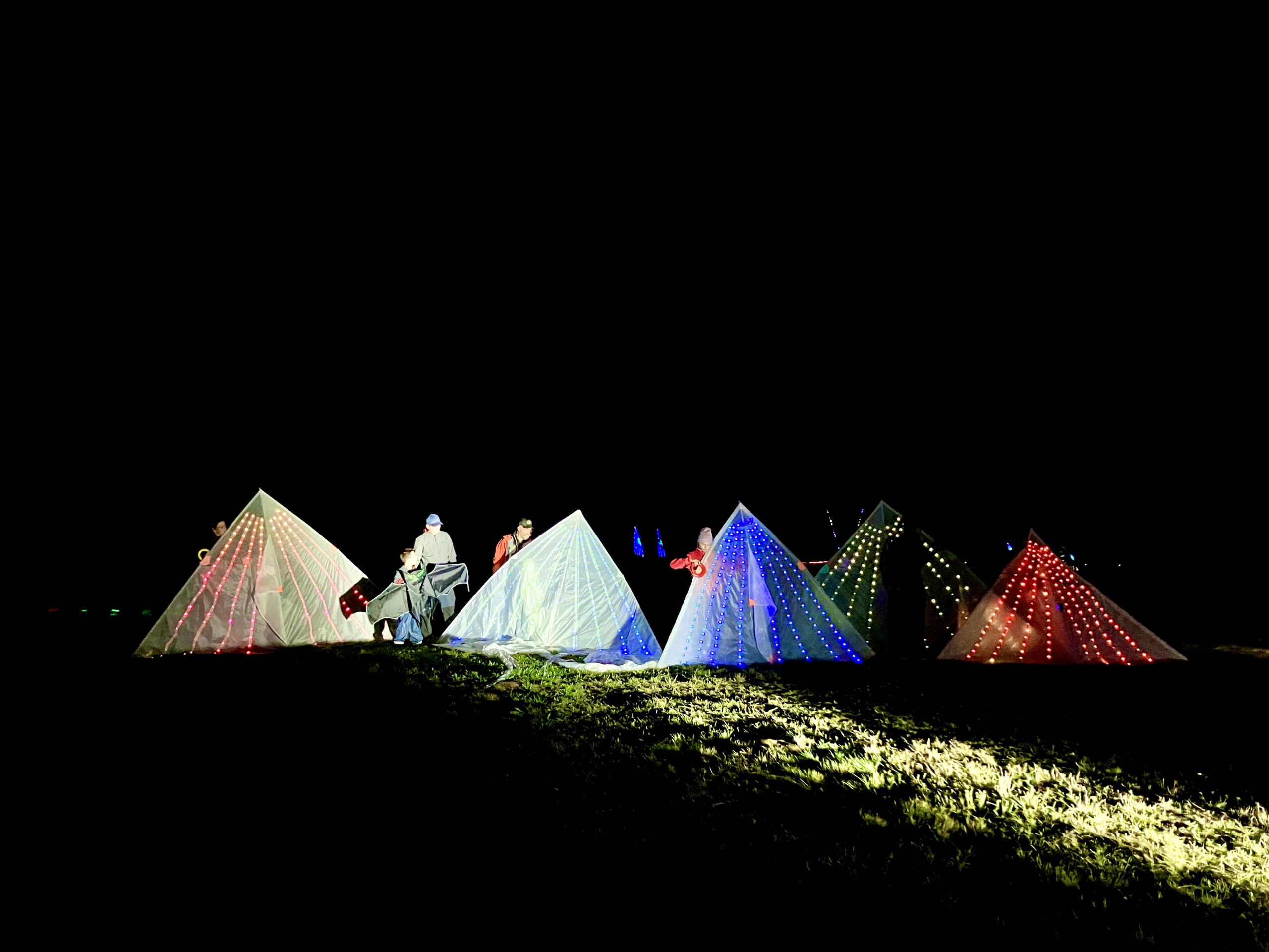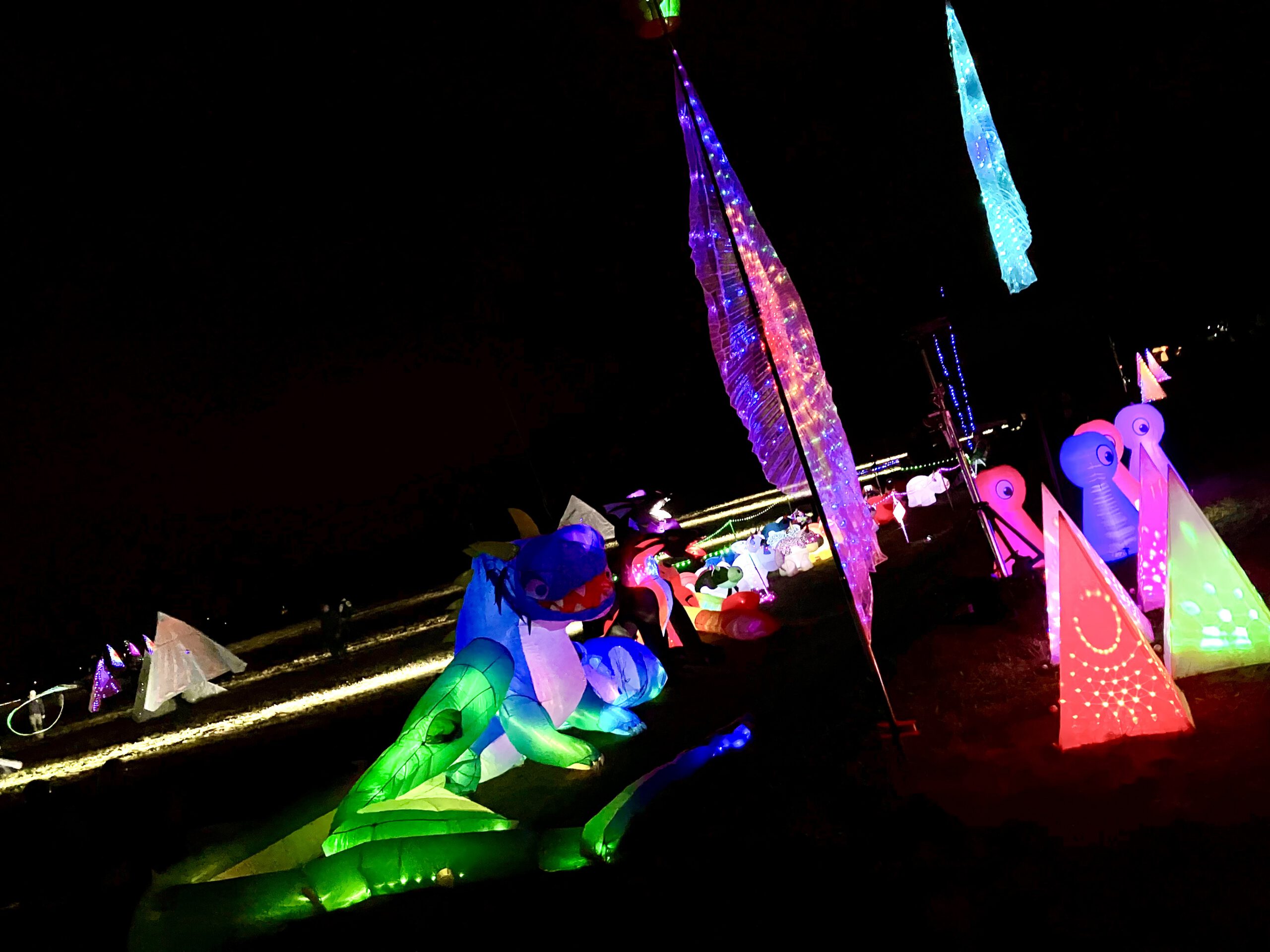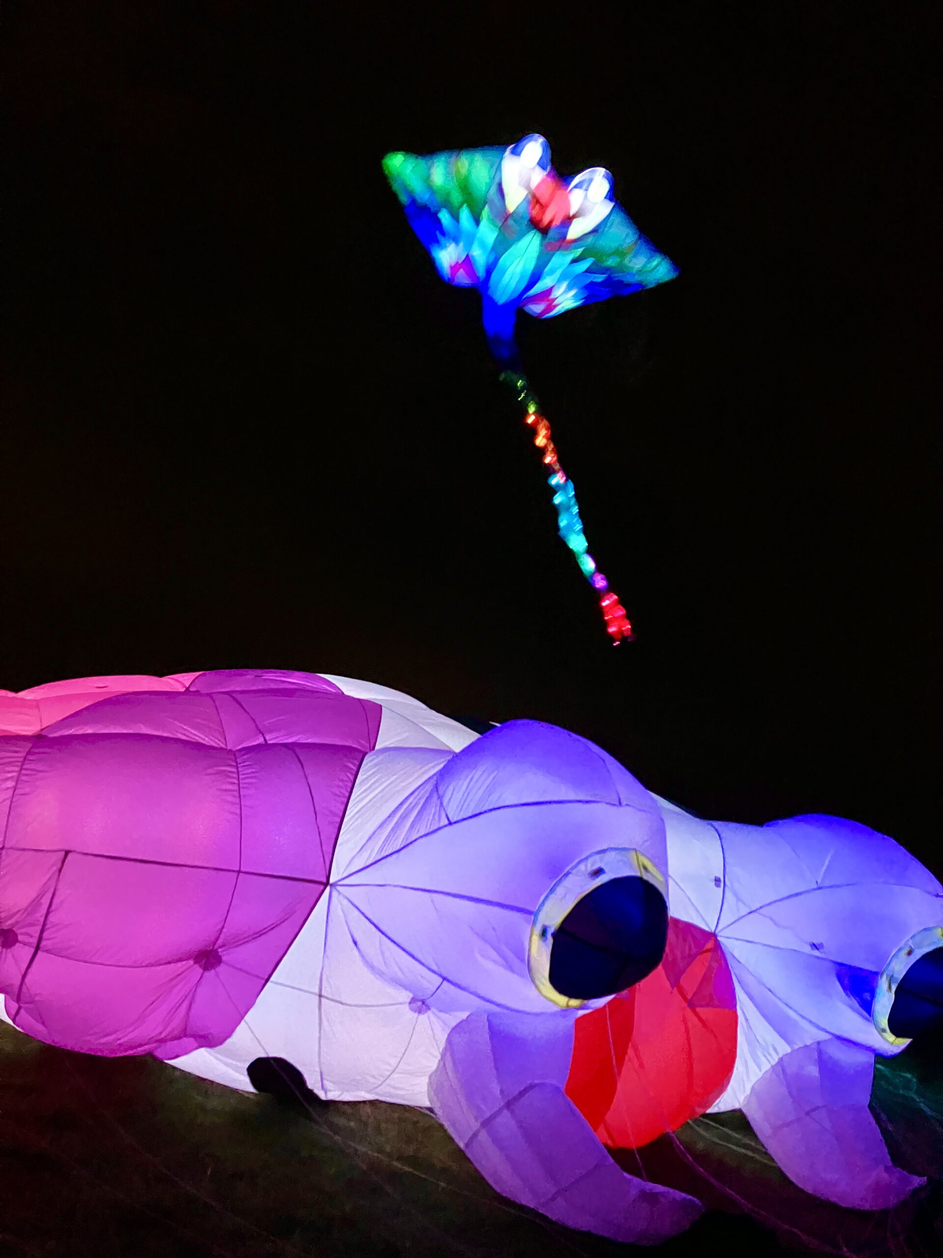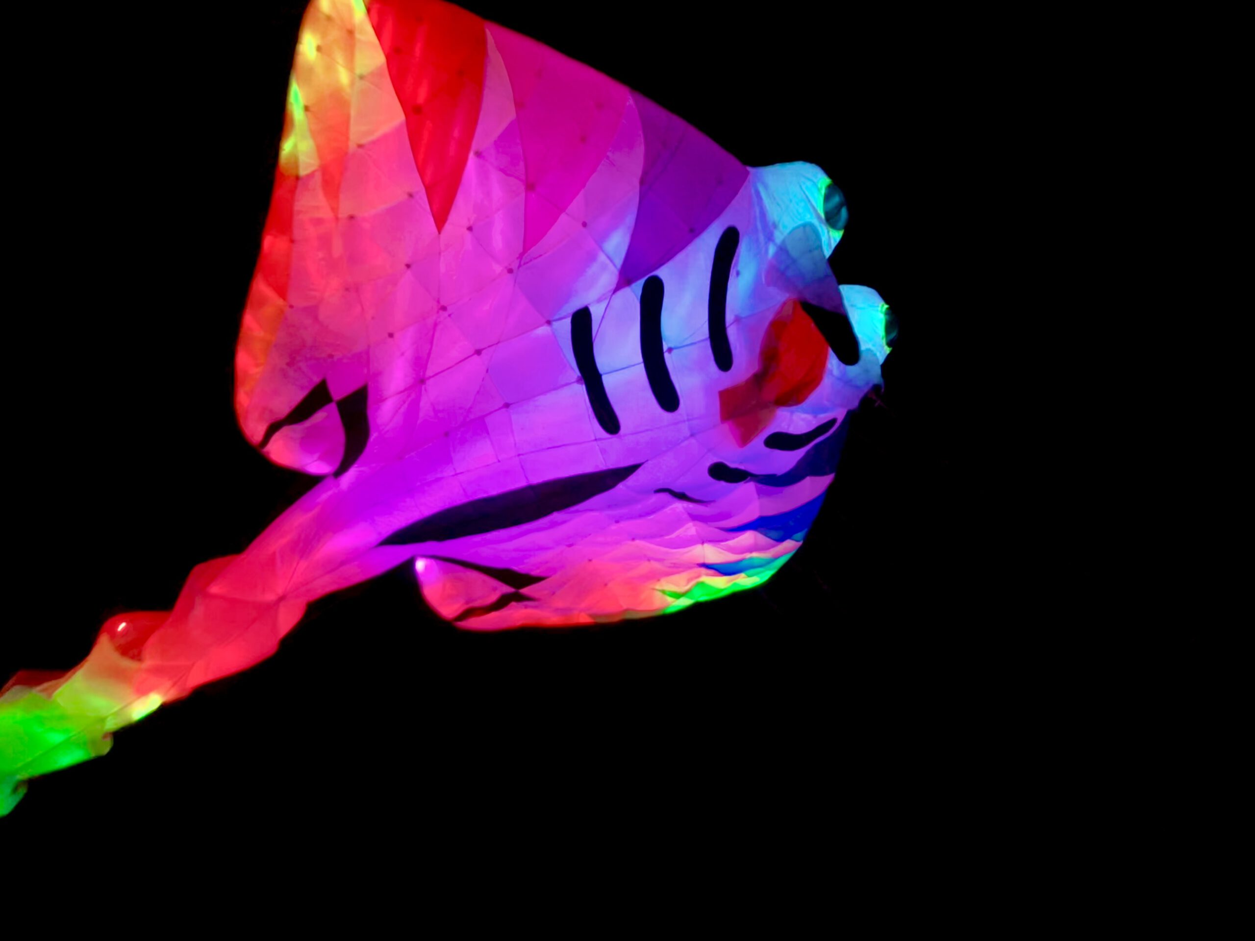 Mit Einbruch der Dunkelheit begann das Nachtfliegen. Wir hatten vorher in einem Workshop 8 Led-Deltadrachen gebaut mit je 20m Led-Ketten, die u.a. zum Einsatz kamen. Die Zuschauer belohnten die Show mit lautem Applaus.
